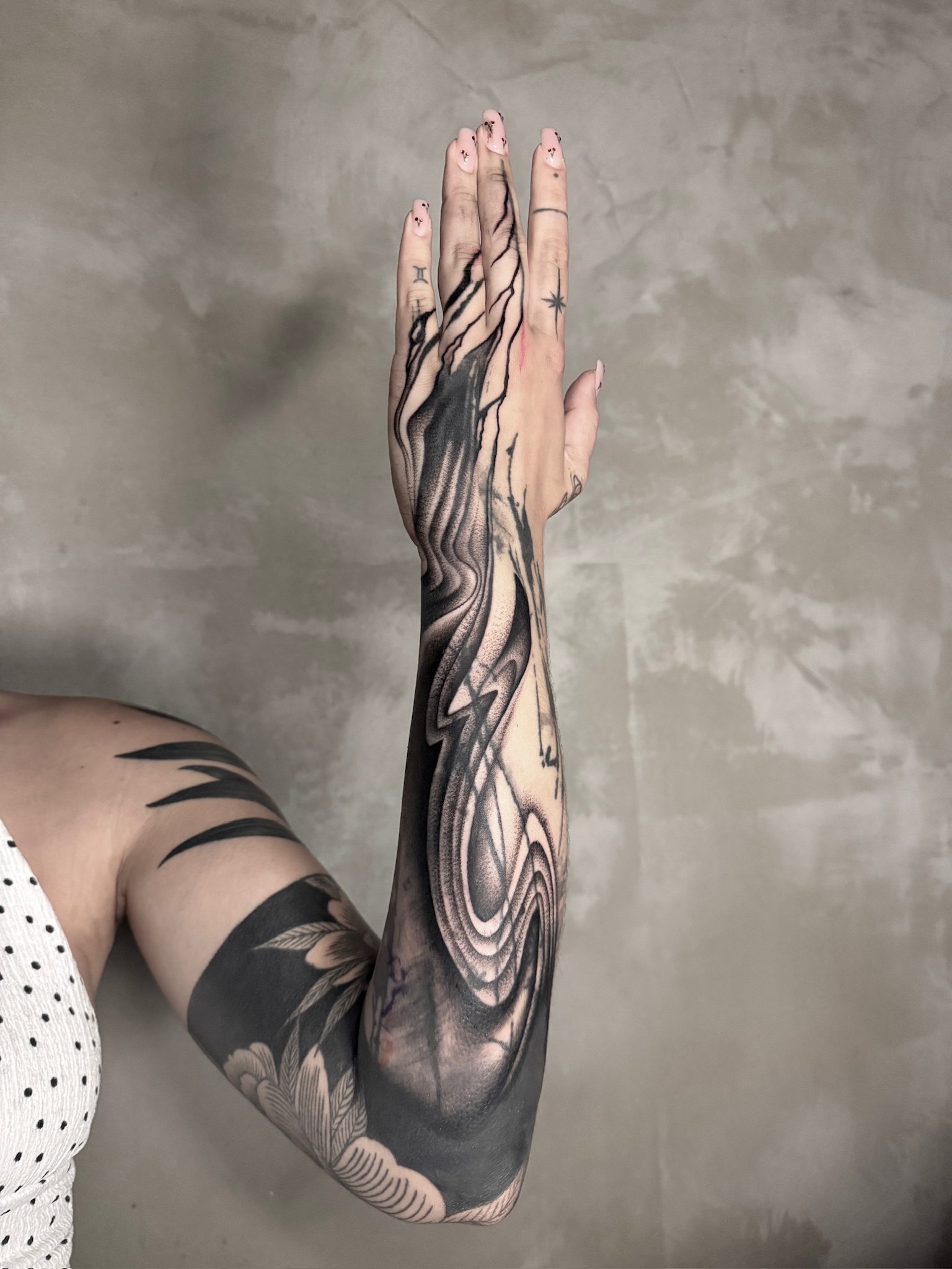 I work mainly in black and grey — blending fine graphics, micro and macro realism, abstract elements, and symbolism. I love combining different styles to create designs that resonate with a person’s story and vision.