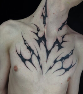 Styl Heavy Black není pro každého – je to syrový výraz síly, tmy a osobní identity. Masivní černé plochy, silné linie a ostrý kontrast vytváří vizuálně působivý efekt, který nejde přehlédnout. Žádné polotóny, žádné kompromisy – jen čirá esence formy a symboliky. Ideální pro ty, kteří hledají silný výtvarný jazyk bez zbytečných slov.