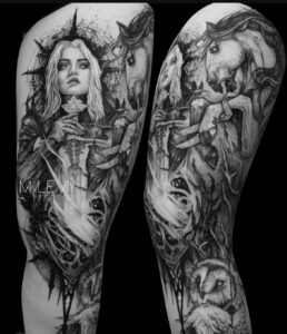 Black & grey realismus je elegantní, silný a nesmírně estetický. Bez použití barvy dokáže vytvořit obraz, který má hloubku, lesk a emoci. Vhodný pro portréty, historické postavy, filmové scény, náboženské motivy či symboliku. Tento styl je nadčasový, působivý a vyžaduje obrovskou technickou zručnost.