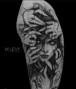 Grafický styl je jako galerie na kůži – čistý, precizní a vizuálně výrazný. Spojuje prvky ilustrace, designu a často i geometrie, aby vytvořil kompozice, které působí moderně a nadčasově. Ostré linie, kontrasty, někdy i abstraktní symbolika – tento styl vyžaduje dokonalou techniku a cit pro kompozici. Je ideální pro ty, kteří chtějí umělecké tetování s jasnou estetikou a originálním pojetím.